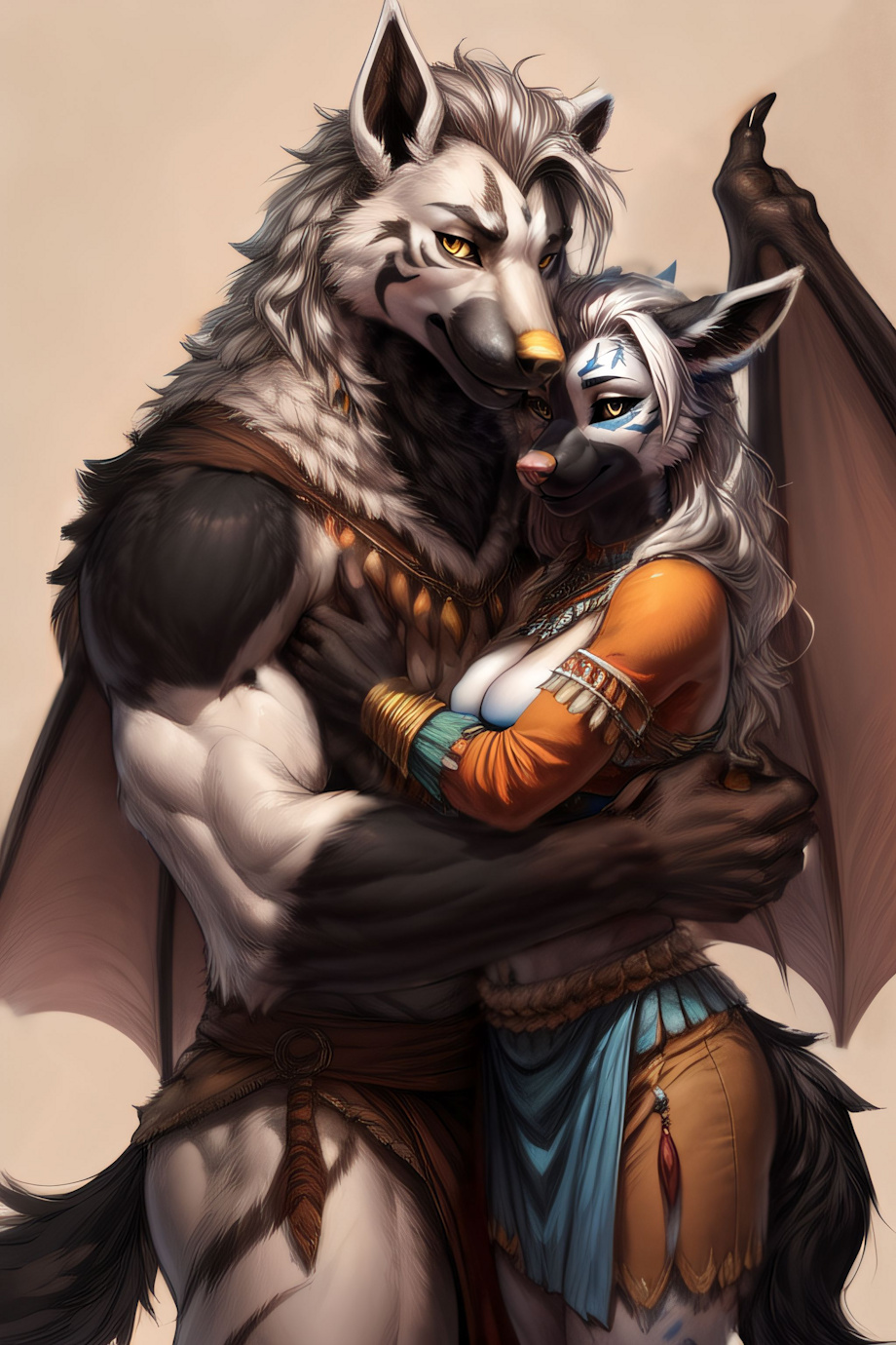 masterpiece, best quality <lora:(1) Furtastic Detailer:1> (tribal outfit:1.5) (looking at viewer, 1girl, 1boy, hug) (size difference:1.4), BREAK <br34k> A (male:1.4) (mightyena:1.4) (black fur:1.4) (white markings:1.4) (muscular:1.3) (digitigrade:1.3) (thick eyelashes:1.3) (silver hair:1.4) (yellow feathers:1.4) (tribal markings:1.3) (silver highlights:1.3) (yellow eyes with black pupils:1.4) (dewlap:1.3) (yellow nose:1.4) (biceps:1.4) (black mouth:1.4) (large black lips:1.3) #BREAK <y0d3l> A (female:1) (mightyena:1.3) (swoobat:1.3) with (blue fur:1.2), (long white hair:1.2), (black wing membranes:1.2) (medium breasts, blue nipples:1.2), (white fangs:1) (mightyena:1.3) (female:1.2) with (black furry forearms:1.3) and a (black diamond fur outline on forehead:1.3). She has, (black eyes with black pupils:1.2) (black sclera:1.5) and wears a (digitigrade:1.2) legs, and (white belly:1.4) (pink nose:1.3) (white mane:1.3) Negative prompt: bloodshot eyes, arms behind back, hands behind back, blurry, blurry background, bad anatomy, bad hands, three hands, three legs, bad arms, missing legs, missing arms, poorly drawn face, bad face, fused face, cloned face, worst face, three crus, extra crus, fused crus, worst feet, three feet, fused feet, fused thigh, three thigh, fused thigh, extra thigh, worst thigh, missing fingers, extra fingers, ugly fingers, long fingers, horn, realistic photo, extra eyes, huge eyes, 2girl, amputation, disconnected limbs, worst quality, normal quality, low quality, low res, blurry, text, watermark, logo, banner, extra digits, cropped, jpeg artifacts, signature, username, error, sketch ,duplicate, ugly, monochrome, horror, geometry, mutation, disgusting, jpeg artifacts, bad quality, jpg artifacts,badhandv4, easynegative boring_e621_v4, (nipples, nude, nudity:2) (erect nipples:2) (topless:2) Steps: 35, Sampler: Euler a, CFG scale: 7, Seed: 2408828656, Size: 512x768, Model hash: 8e2f4f1346, Model: yiffymix_v44, VAE hash: 24e650297c, VAE: furception_vae_1-0.safetensors, Denoising strength: 0.55, Mask blur: 4, CFG Rescale: 0.7, Lora hashes: "(1) Furtastic Detailer: 2e94914f676c", Version: v1.6.0 postprocessing Postprocess upscale by: 4, Postprocess upscaler: 4xUltrasharp_4xUltrasharpV10.pth extras Postprocess upscale by: 4, Postprocess upscaler: 4xUltrasharp_4xUltrasharpV10.pth |