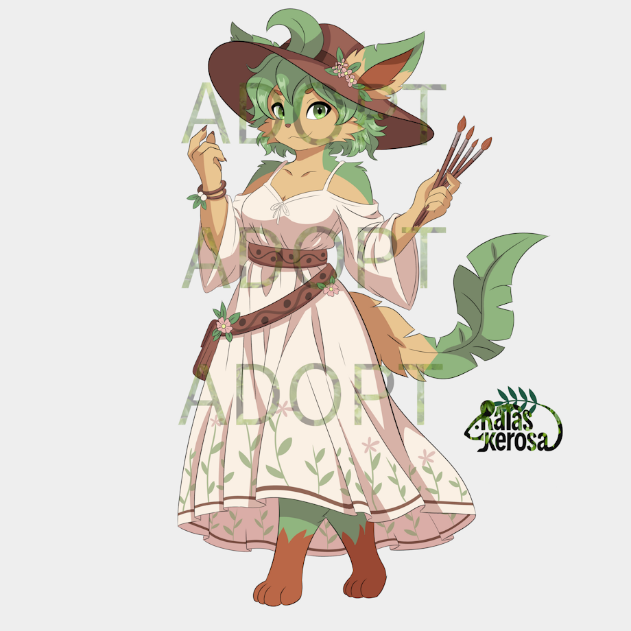 This adopt features a soft, creative Leafeon-based anthro girl with a bohemian flair. She wears a flowing, flower-patterned dress, leather belts, and a wide-brimmed hat adorned with natural motifs. Holding a set of brushes, she radiates warmth, gentleness, and artistic energy — ideal for cozy fantasy settings, slice-of-life RP, or cottagecore-inspired storytelling.