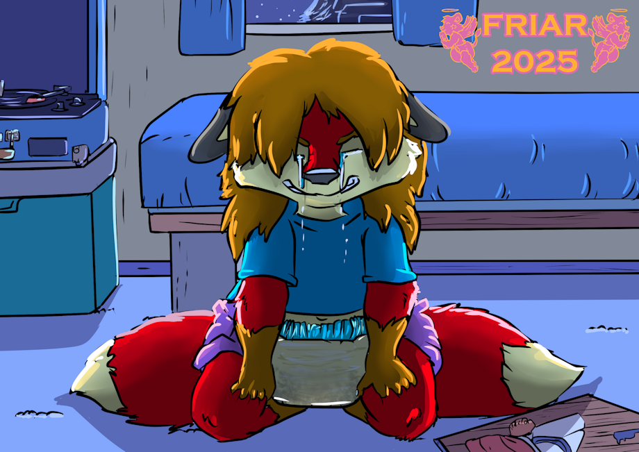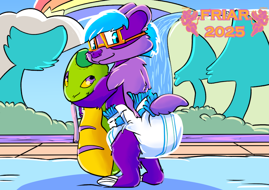 Illustration of Everett the wet and messy diapered badger holding his snake plushie in front of a daycare mural of a waterfall, trees, and a rainbow. Everett is drawn in a slightly different style.