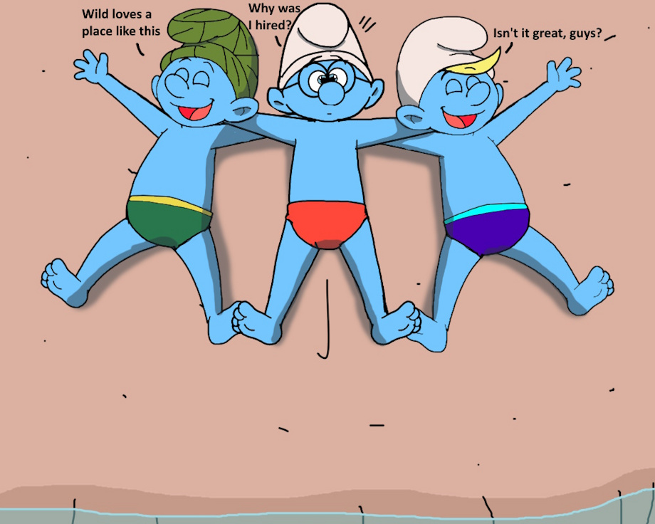 three smurfs on beach lying - Wild, Brainy and Oliver