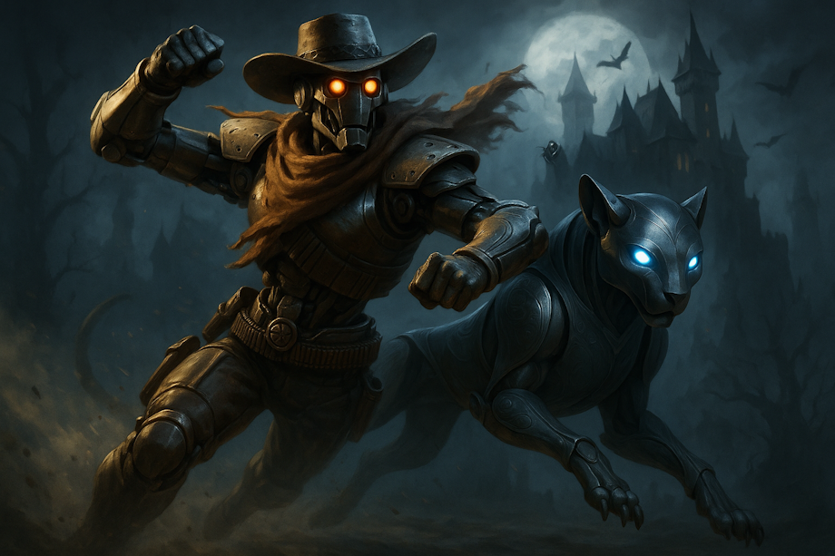 Prompt: with reference imaged create an action pose with a Ravenloft Motif.