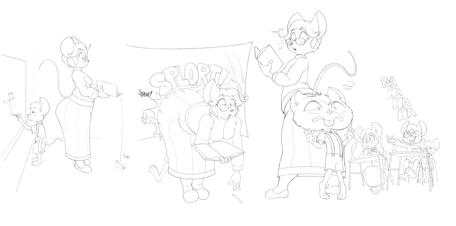 And thus, having to make due, they get "creative" with their problem solving. Being a cartoon, these characters are able to get squashed, stretched, inflated, and whatever else toons get into, so they often use that to their advantage, transforming each other into supplies and tools they need to accomplish their tasks! Or, perhaps, as punishment for misbehaving in class, Mrs. Thrushwood might "volunteer" them to be used as a prop for whatever subject she's teaching. If they're really bad, like the class clown Skivvy, they might be used as a seat cushion for Mrs. Thrushwood as opposed to sitting in the corner(Though in Skivvy's case, he might be acting out because he wants Mrs. Hedgetuft to sit on him~).