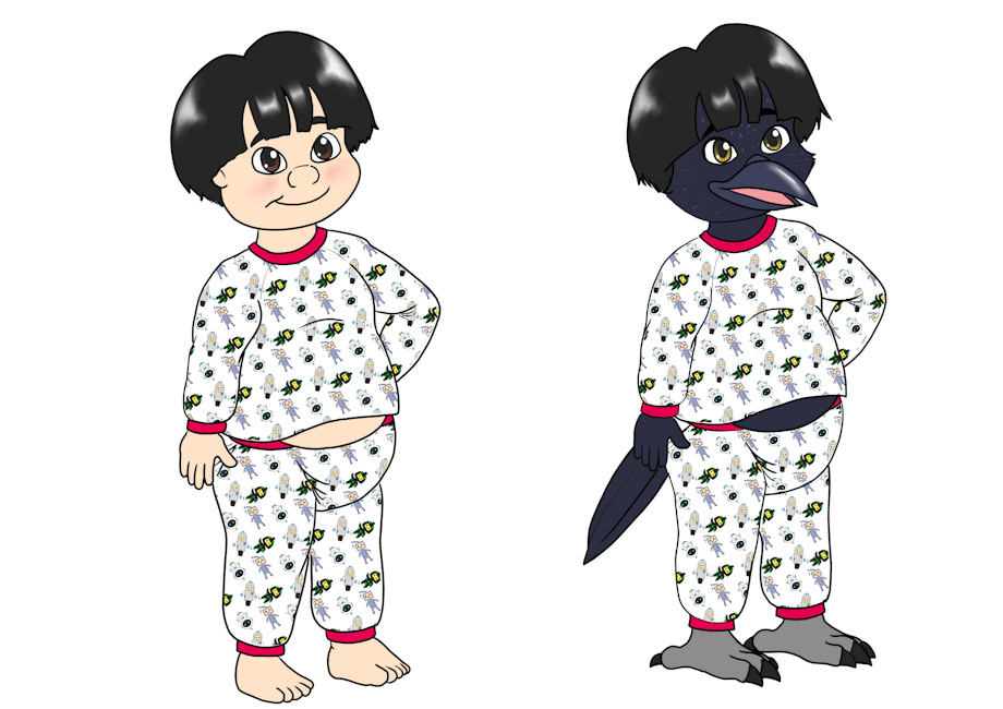 A cute boy ready for bed time in his jammies and padding. Human and Raven versions.