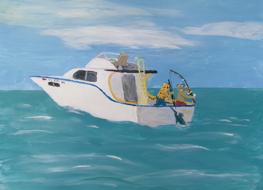 My fursona Buster Cougar and a cheetah friend Bernie went salt water fishing one weekend twenty miles off the coast of Saint Petersburg in the Gulf. After a few hours of it looking like nothing was going to bite, my fursona felt a hard tug on the line. It put up a fight as Buster began reeling it in. Buster and Bernie knew the fish on the line was a big one. The fish jumped out of the water trying to shake the line loose to no avail. Buster Cougar said with excitement, "A swordfish! A big one too!" Bernie Cheetah told Buster, "Oh boy, you got a prize there!" That's when Bernie Cheetah laid his rod and reel down in the boat to assist Buster at the time he gets the swordfish near the boat.. It was a fight and a challenge reeling the fish in. There were times the swordfish at the end of the one hundred and thirty pound test line would bolt out away from the boat as the reel set at forty drag would sound off a rapid clicking whir. Buster would pull up the rod and wind in the slack as he let the rod back down. The swordfish would bolt out away again as the reel sounded off a rapid clicking whir. Buster continued to raise and lower the rod while reeling in the slack. The swordfish jumped above the water again and again trying to shake the line loose. After the swordfish putting up a fight for more than fifty minutes, Buster finally managed to reel the swordfish to the stern of the boat. Bernie Cheetah extended a gaff down and hooked it under one of the swordfish's gills. Even then the swordfish tried to shake loose from gaff, but Bernie made sure the gaff had a good hold on the fish.