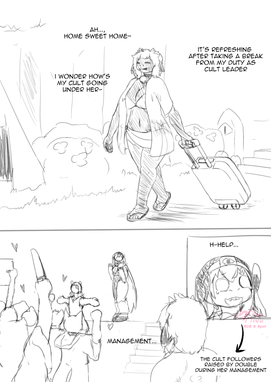 The real cult leader just arrived home and see the followers start cheering the subtitute cult leader which is overwhelmed.
