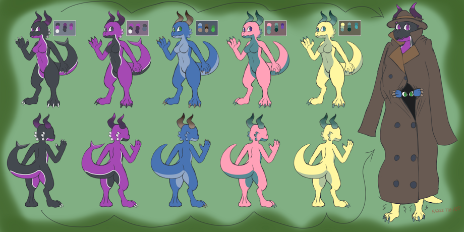 Finished up a ref sheet commission for a character that is 5 kobolds in a trenchcoat haha loved the idea, very fun