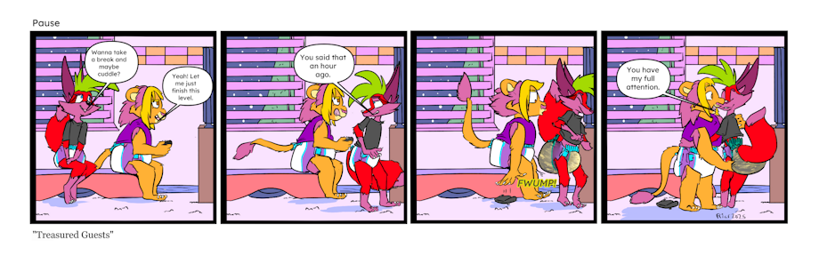 Illustration of Ozzy the wet and messy diapered two tailed fox sucking his pacifier while seated on the changing table.