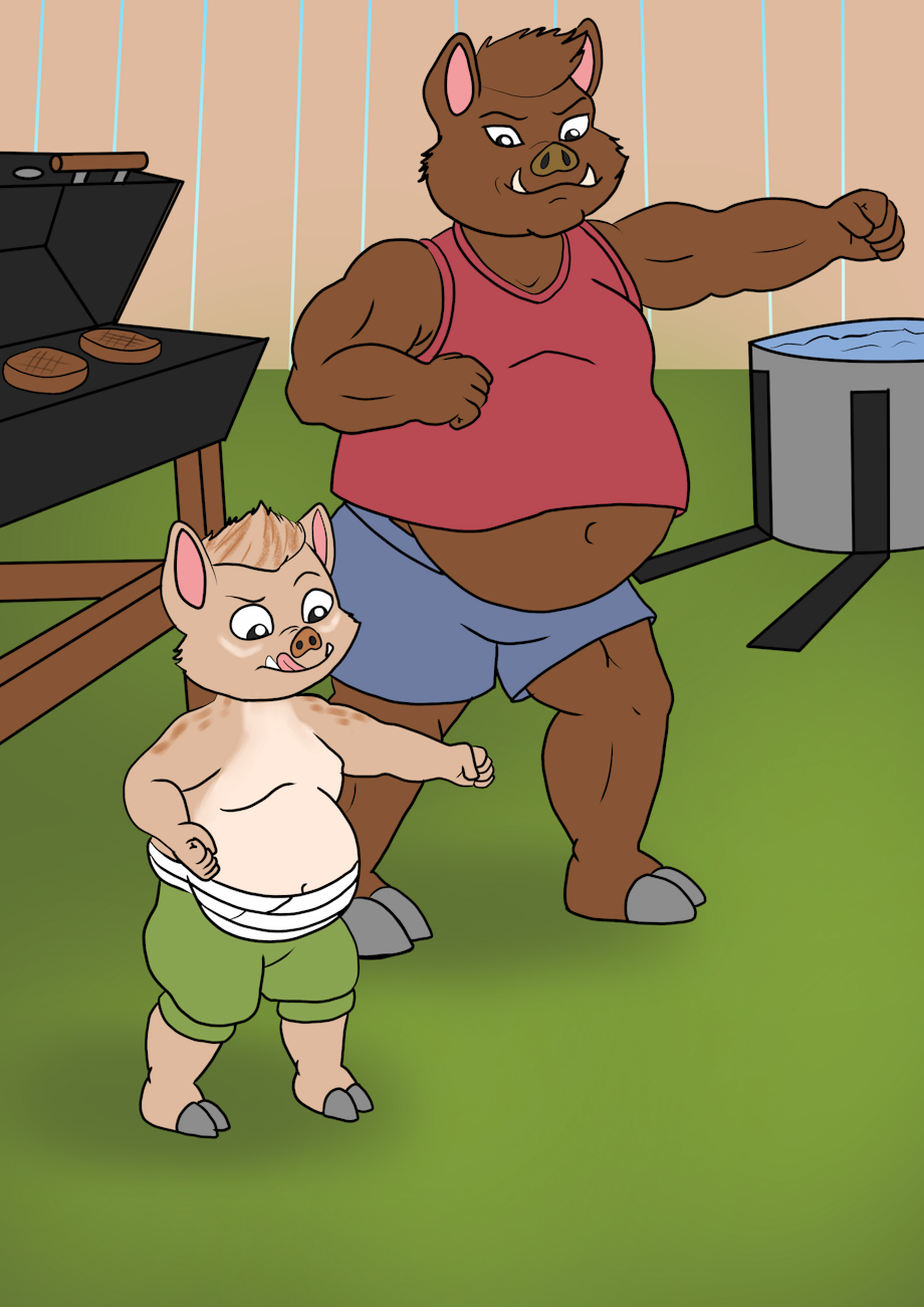 Seems this little piggy is trying to show off for dad while he's cooking lunch one afternoon. Probably watching too much anime given the belly wrap.