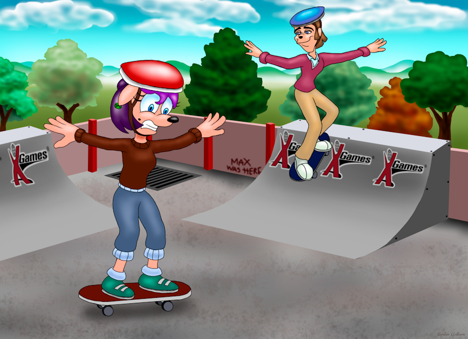 This drawing is based on a request by JadeHarmony(requests are currently closed) who wanted her goofsona skateboarding with Bradley Uppercrust(from An Extremely Goofy Movie). As you can see, Bradley has no problems casually going up and down the ramps while Jade is struggling just to stay on her board. Let's hope she doesn't fall over!
