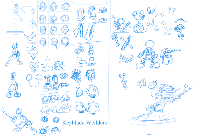 So, I sketched up some ideas for what I'd imagine using for making miniatures for a TTRPG like DnD or Warhammer, but themed after Kingdom Hearts. With some ideas for interchangable armor parts, hand gestures or other such things and different bases for different factions.