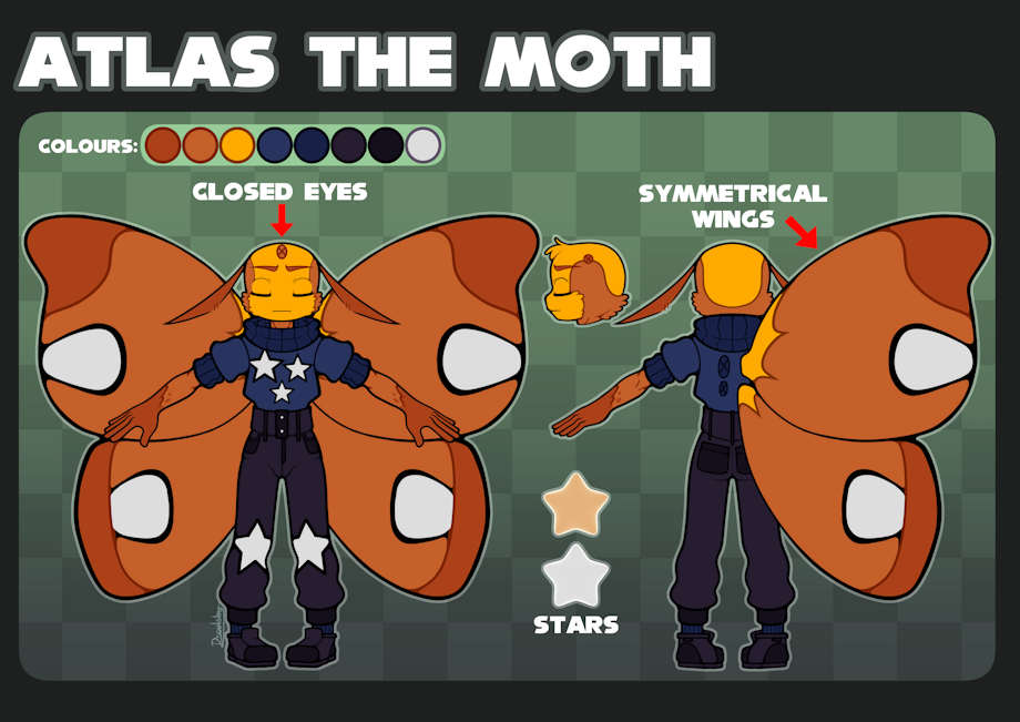 A nerdy yet stoic moth who is fascinated by knowledge. He's the most sensible of his friend group and very protective of Meco. However, He's not particularly fast, yet has immense power. Atlas is always willing to teach and is fairly friendly to those who struggle with learning disabilities. However, he can get easily frustrated. Especially with Bunny for how crude he can be or his idiotic decision-making/ lack thereof.