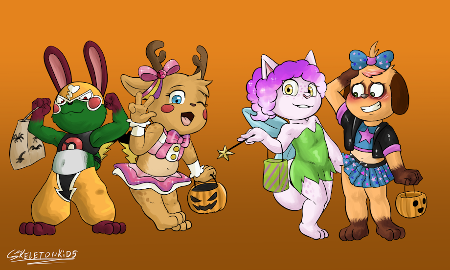 and it is drawn by Skeletonkid5, which the link is in the description below; https://x.com/SkeletonKid5 The FurryPatrol Gang (and Mimi) went out for trick or treating this year! Bun dressed up as Pikachu LIbre, Blossom dressed up as Popstar Pikachu, Mimi dressed up as Pilou in her concert outfit and as for Flurry, you can say he decided to go as Tinker Bell this year. Those are some unique costumes indeed.