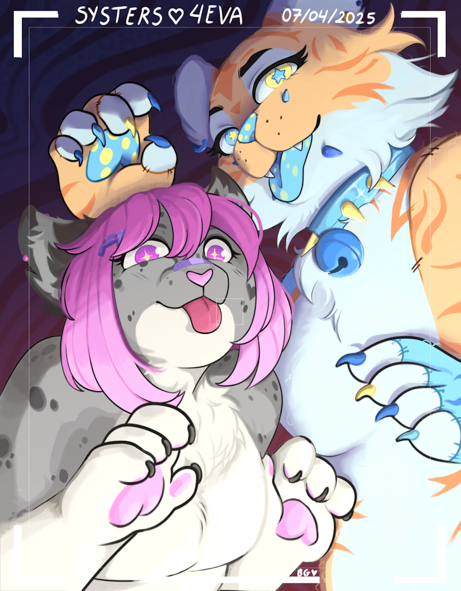 Me and my sister being absolute goofballs in front of the camera, drawn by our bestie