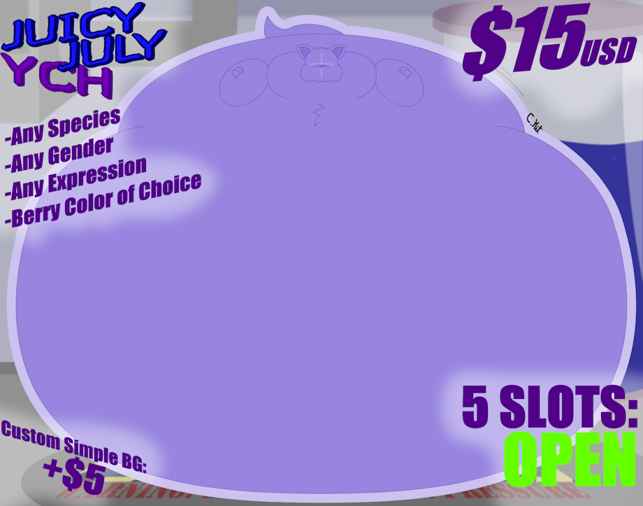As usual, It cost $15, The Picture will be a Fully Colored, Shaded character with a Simple BG included. It can be any Gender, species, expression or even any juicy berry color! If you want to have a different Simple Background, I can do one for $5 extra.