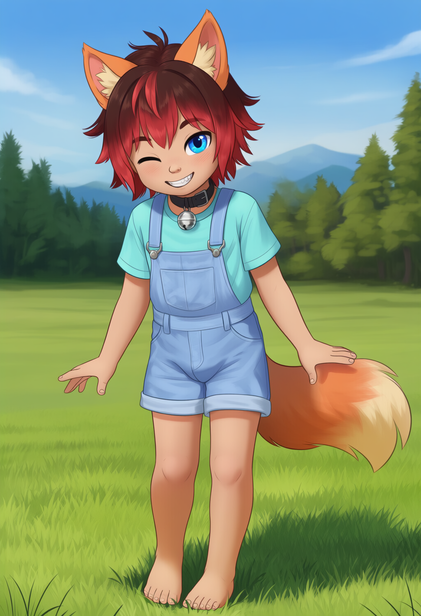 highly finished, human fox, Orange fox ears with sandy-colored tips, dark brown with blended reddish undertone hair neat short cut covers ears. Wearing a black collar with silver bell, light tan ears, stylized, human skin, vivid reflective blue metallic eyes. Lifted tail, cute butt, 1.2::Wearing light blue denim shortalls::, light pastel t-shirt, high quality soft shading, rear view,