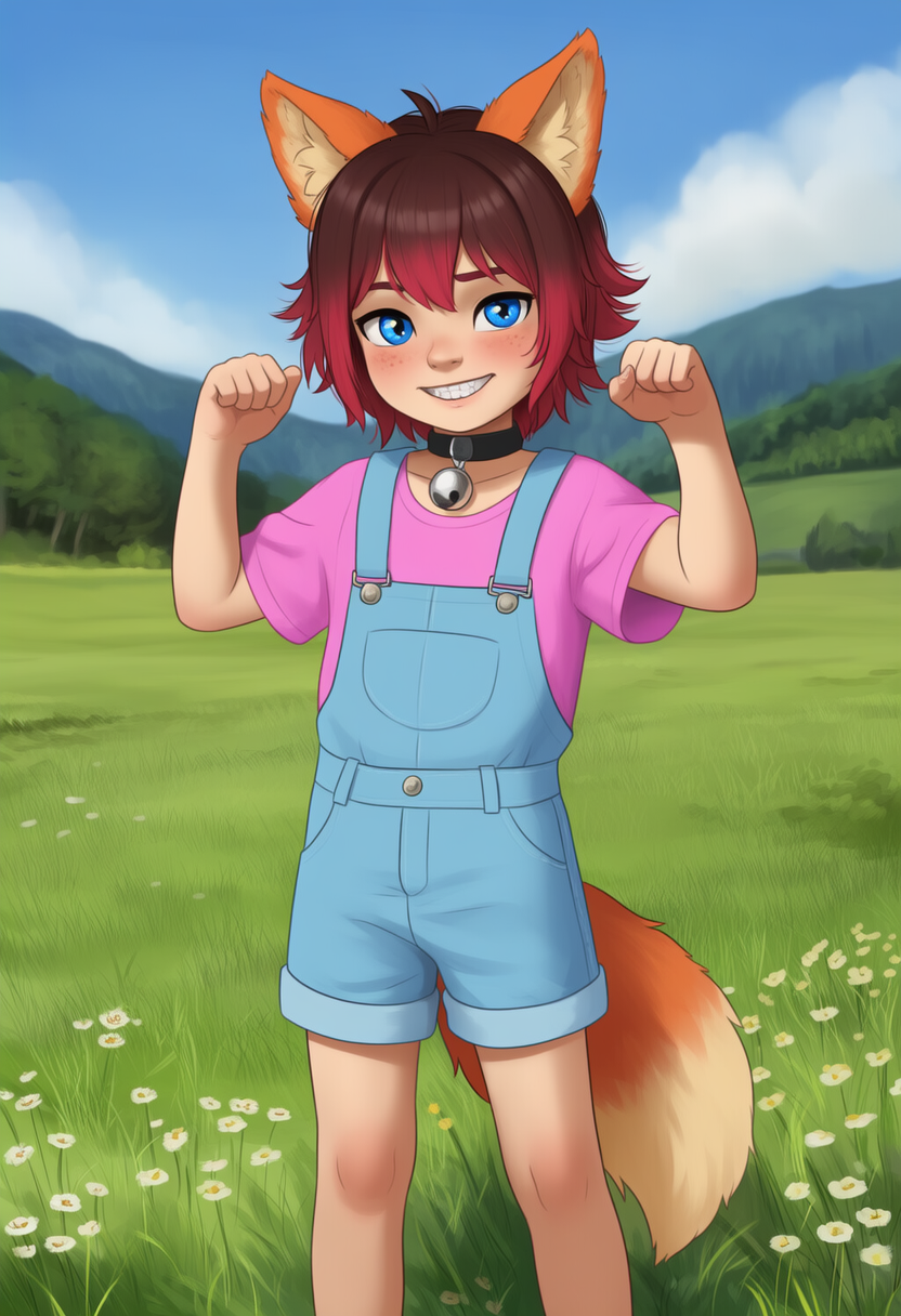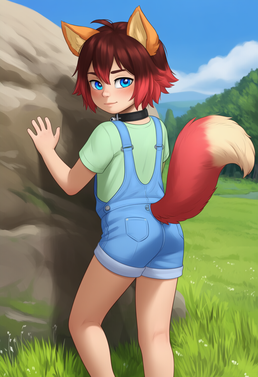 highly finished, human fox, Orange fox ears with sandy-colored tips, dark brown with blended reddish undertone hair neat short cut covers ears. Wearing a black collar with silver bell, light tan ears, stylized, human skin, vivid reflective blue metallic eyes. Lifted tail, cute butt, 1.2::Wearing light blue denim shortalls::, light pastel t-shirt, high quality soft shading, rear view,