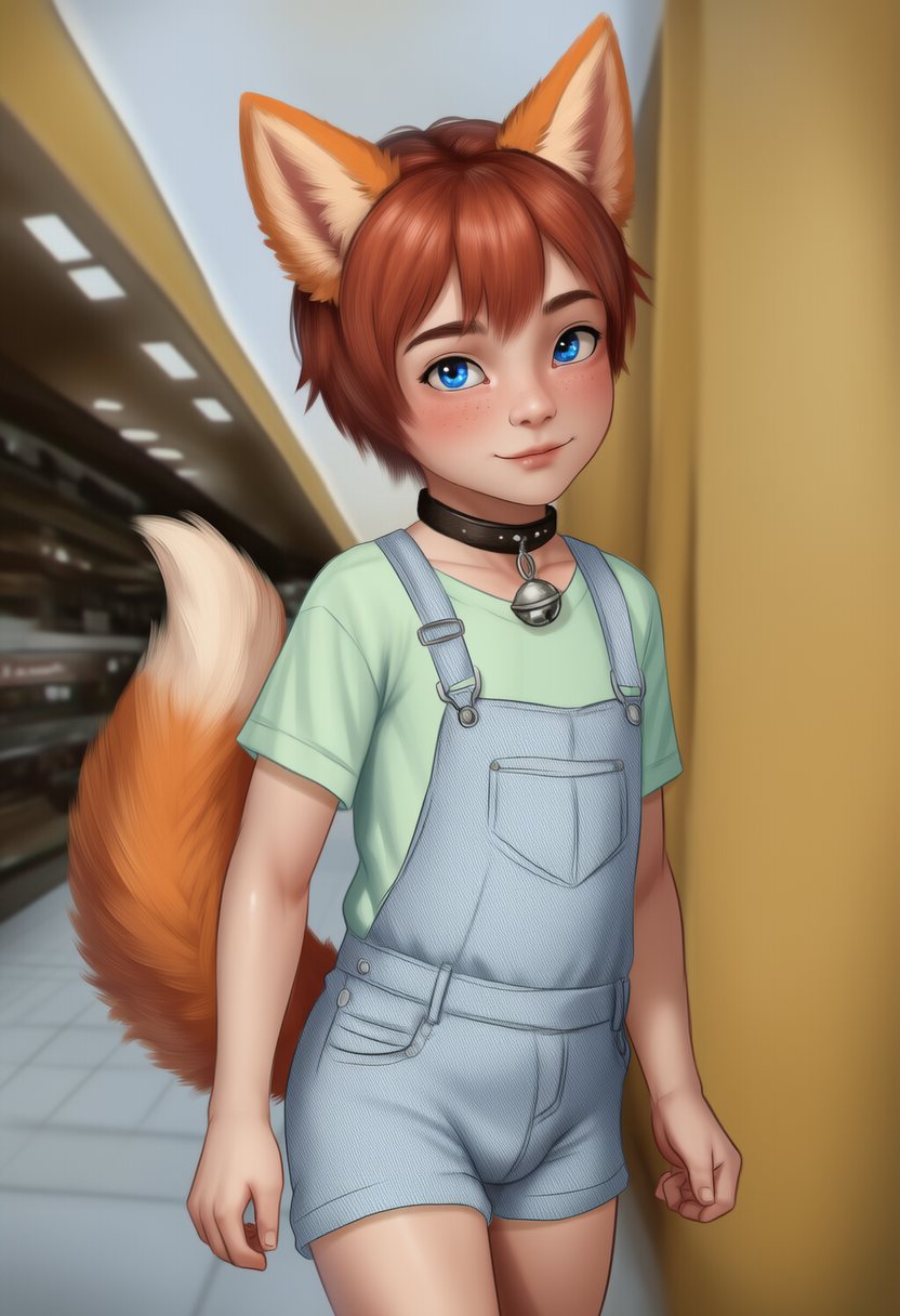 highly finished, human fox, Orange fox ears with sandy-colored tips, dark brown with blended reddish undertone hair neat short cut. Wearing a black collar with silver bell, light tan ears, stylized, human skin, vivid reflective blue metallic eyes. Lifted tail, 1.2::Wearing light blue denim shortalls::, light green pastel t-shirt, high quality soft shading, overalls, walking through mall, 1.5::realistic::, -1::extra ears ::