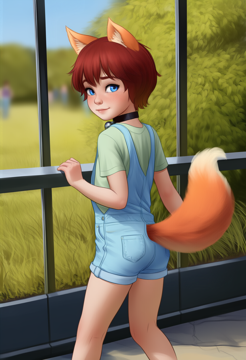 highly finished, human fox, Orange fox ears with sandy-colored tips, dark brown with blended reddish undertone hair neat short cut covers ears. Wearing a black collar with silver bell, light tan ears, stylized, human skin, vivid reflective blue metallic eyes. Lifted tail, cute butt, 1.2::Wearing light blue denim shortalls::, light pastel t-shirt, high quality soft shading, rear view,