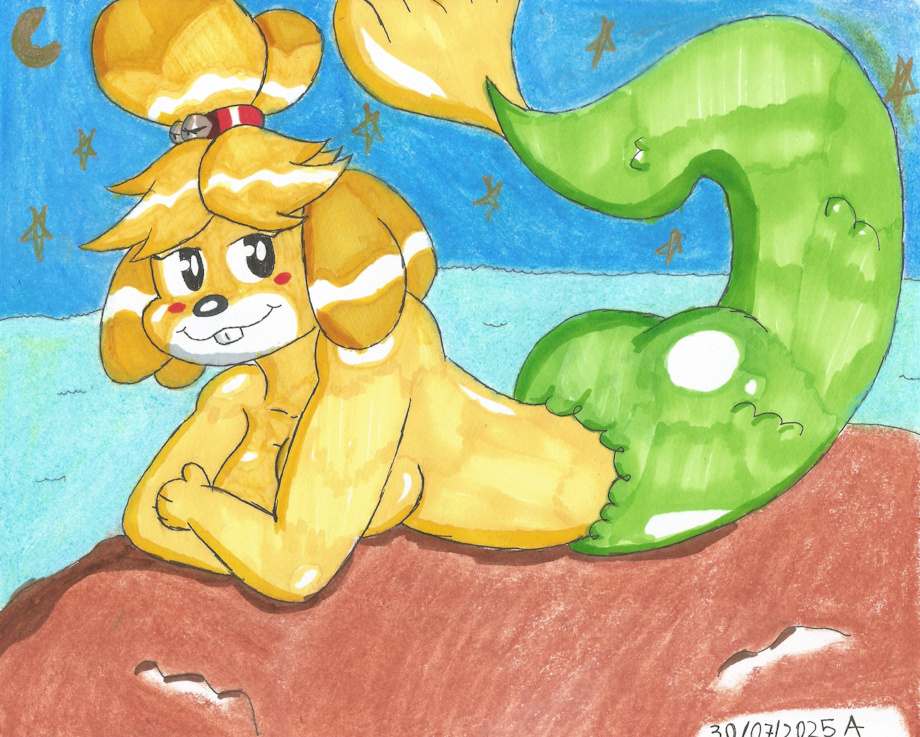 Isabelle, the secretary dog from Animal Crossing, as a mermaid, at the suggestion of a friend. I was supposed to draw her in May for the Mermaid show. But I didn't feel like drawing at the time and didn't know what pose to use. I'm posting it now because I have time. It won't be the anatomy or the canon design, but it made me happy to draw like this, giving me the creative choices I want.