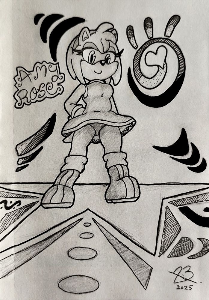 It's another Amy Rose! I learned how to draw by drawing Sonic characters, so when I don't have any specific direction I tend to default to them. Amy has been a popular choice for me - I do like Amy's character design - but she's also a female character, and a lot of my art lately has been to push me to get better at female anatomy.