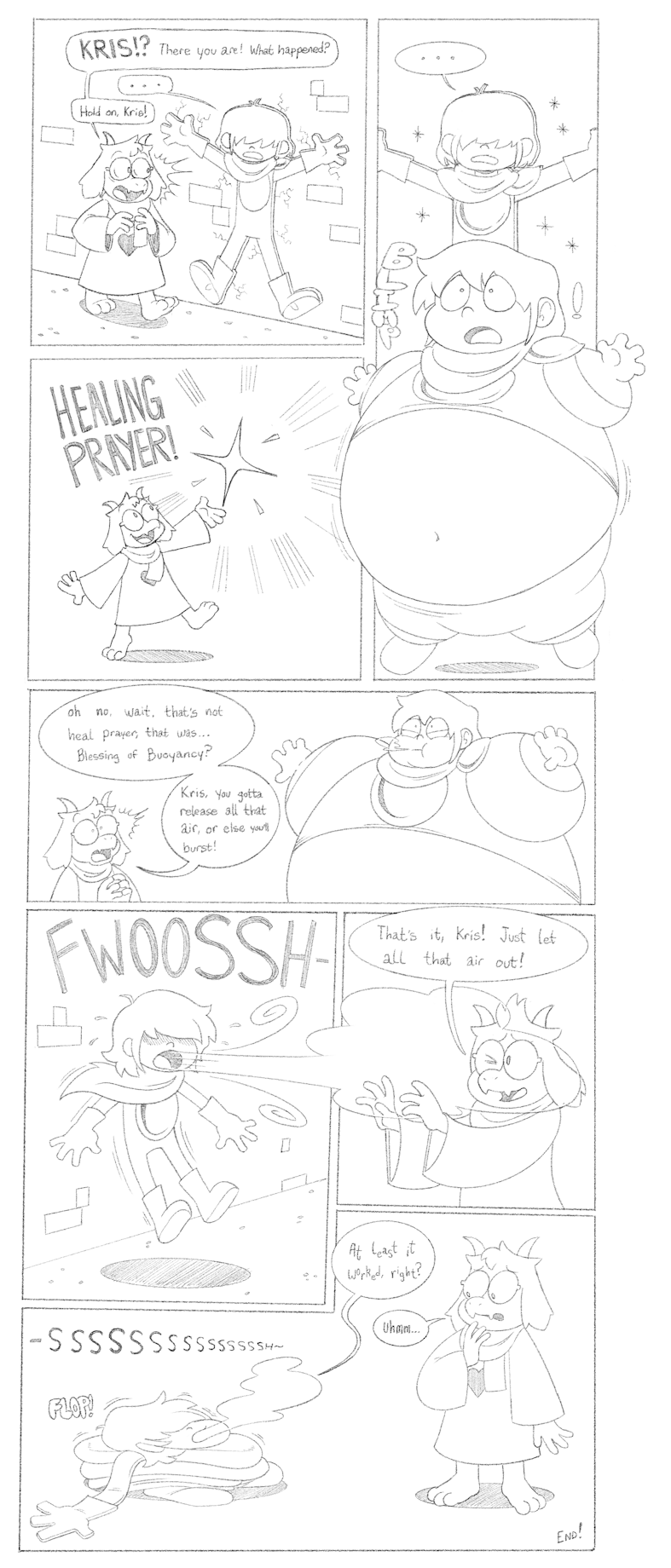 I sketched this comic a few months back in the hype for the new Deltarune chapters! I liked the idea of Ralsei's magical healing spells backfiring in some way, leading to some silly situational comedy. Healing magic must be tricky, especially if messing up the spell results in this happening! Not to worry though, I'm sure Ralsei got it right the second time...