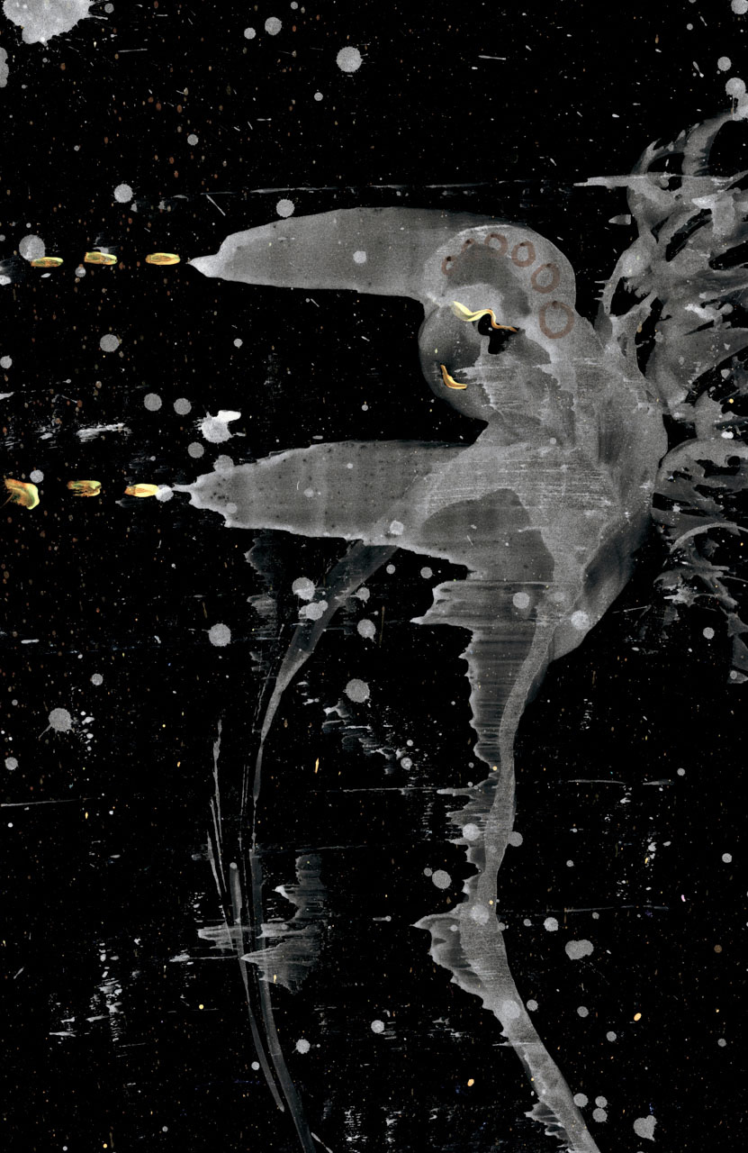 Scheduler can't alt-text some sites, so alt: Abstract mixed media inversion figure/face studies, often non-human. Golds and blues on black, mostly.