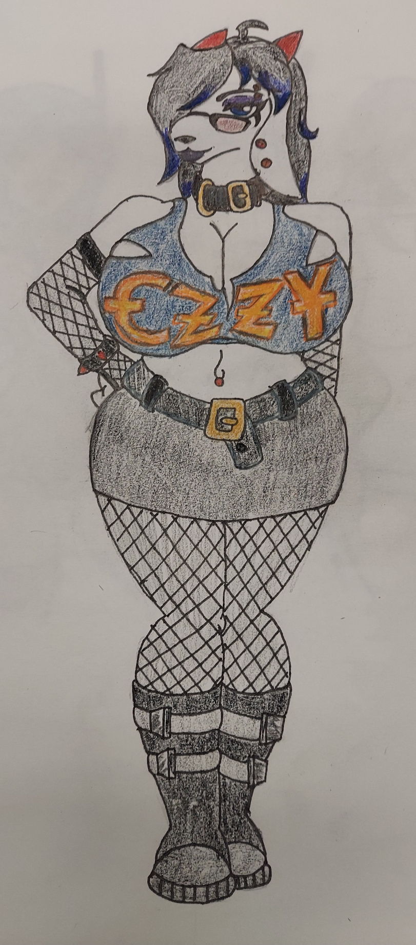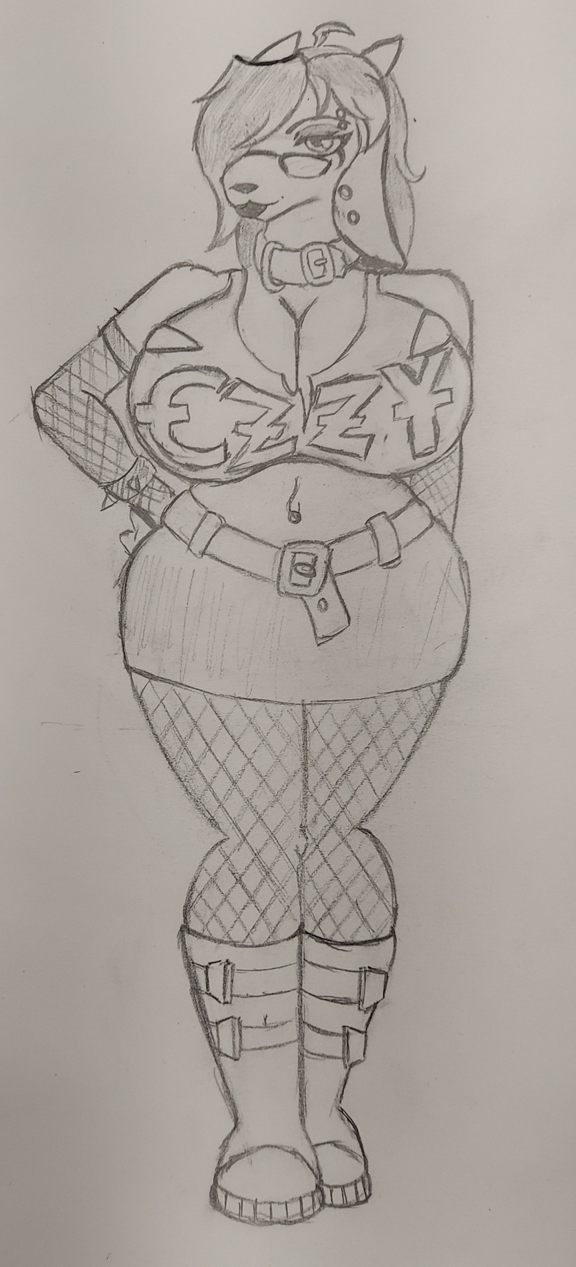 Claire is 5 foot 7 (without her boots) and dummy thicc. Her tits are H cups, a massive increase from their original E cup size before she got pregnant. Her hair is always dyed black with the tips colored dark blue. She has multiple piercings, most of which are visible like the one in her eyebrow and the studs in her ears. The ones not visible are her barbells on her nipples. She's a futanari, having both male and female sexual organs and a hefty set of balls.