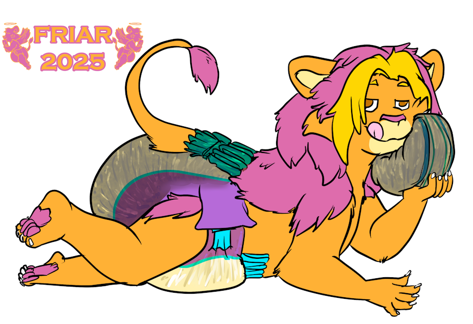 Illustration of Friar the wet and messy diapered lion laying on his tummy on the changing table while snoofing a diaper.
