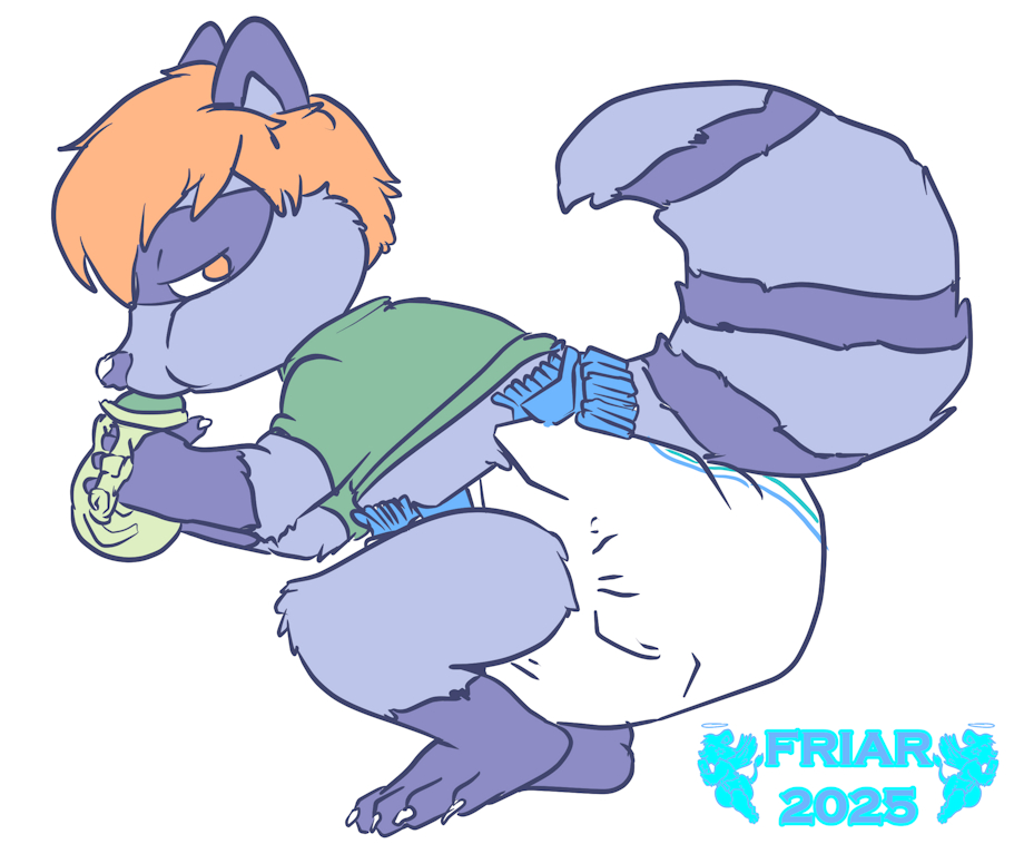 Illustration of Tylahn the wet and messy diapered raccoon drinking soda from his sippie cup while squatting in front of