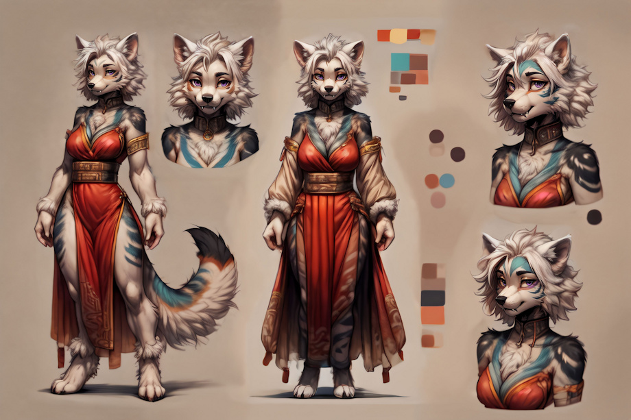 masterpiece, best quality <lora:(1) Furtastic Detailer:1> (solo:1.3) (closeup:1.3) (blue legless dress:1.4), BREAK <h314yn4> A (female:1) (komainu:1.3) with (milf body), (medium length white hair:1.3), (white mane, chest hair, chest tuft:1.4) (hitop fade:1.3) (purple eyes with black pupils:1), (fangs:1.4) (white fur:1.3) (blue parallel stripes:1), (digitigrade:1) legs, and (fluffy tail:1) (dog girl) She wears a (leather collar:1) (shoulder tuft, ankle tuft, wrist tuft:1.4) (medium breasts:1.2) , (clothes:2) Negative prompt: bloodshot eyes, arms behind back, hands behind back, blurry, blurry background, bad anatomy, bad hands, three hands, three legs, bad arms, missing legs, missing arms, poorly drawn face, bad face, fused face, cloned face, worst face, three crus, extra crus, fused crus, worst feet, three feet, fused feet, fused thigh, three thigh, fused thigh, extra thigh, worst thigh, missing fingers, extra fingers, ugly fingers, long fingers, horn, realistic photo, extra eyes, huge eyes, 2girl, amputation, disconnected limbs, worst quality, normal quality, low quality, low res, blurry, text, watermark, logo, banner, extra digits, cropped, jpeg artifacts, signature, username, error, sketch ,duplicate, ugly, monochrome, horror, geometry, mutation, disgusting, jpeg artifacts, bad quality, jpg artifacts,badhandv4, easynegative boring_e621_v4, bad quality, worst quality, bloodshot eyes, 2 tails, nipples Asian-Less2-Neg, black fur on forearms, black fur on legs, bell on ears,, bloodshot eyes, (nipples, nude, nudity:2) (erect nipples:2) (topless:2), black fur on forearms, black fur on legs, bell on ears,, (nipples, nude, nudity:2) (erect nipples:2) (topless:2), (nipples, nude, nudity:2) (erect nipples:2) (topless:2), (nipples, nude, nudity:2) (erect nipples:2) (topless:2), (nipples, nude, nudity:2) (erect nipples:2) (topless:2) Steps: 35, Sampler: Euler a, CFG scale: 7, Seed: 3997400521, Size: 768x768, Model hash: 8e2f4f1346, Model: yiffymix_v44, VAE hash: 24e650297c, VAE: furception_vae_1-0.safetensors, Denoising strength: 0.51, Mask blur: 5, CFG Rescale: 0.7, Lora hashes: "(1) Furtastic Detailer: 2e94914f676c", TI hashes: "badhandv4: 5e40d722fc3d, easynegative: c74b4e810b03, boring_e621_v4: f9b806505bc2, Asian-Less2-Neg: 6584e401aa59", Version: v1.6.0 |