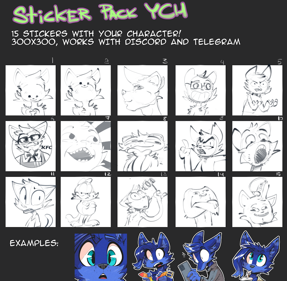 - I will auction these for three days, till sunday, august 10, 22:00 GMT+4 (13:00 New York Time) - The completion time for the stickers is two weeks - The winner gets all 15 stickers, 300x300 pixelsm transparent background, ready to use with discord, telegram or other social media. - The winner can pay for additional stickers (each additional sticker's price will be the same as the final price per sticker) - Bid in the Furaffinity comments. - If you don't have a FA account, dm me your bid and I'll place it there for you
