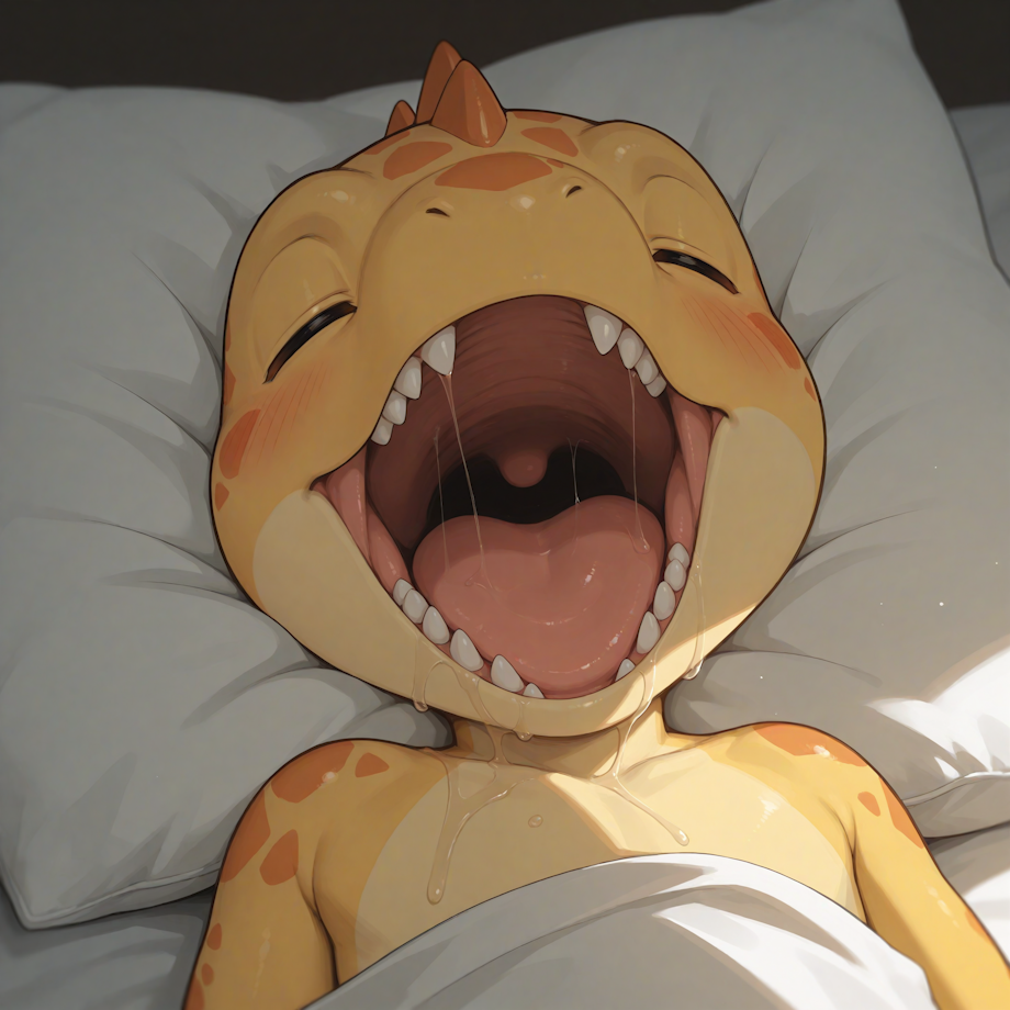 Prompt: (young dragon, masterpiece, high detail, anthro, best quality:1.5), infant, toddler, (sleeping, drooling, open mouth, yawning mouth, extreme closeup in mouth:1.3), small cute horns, naked, face on pillow, drool in mouth, drool pouring from mouth, drool stain on pillow, side view, solo