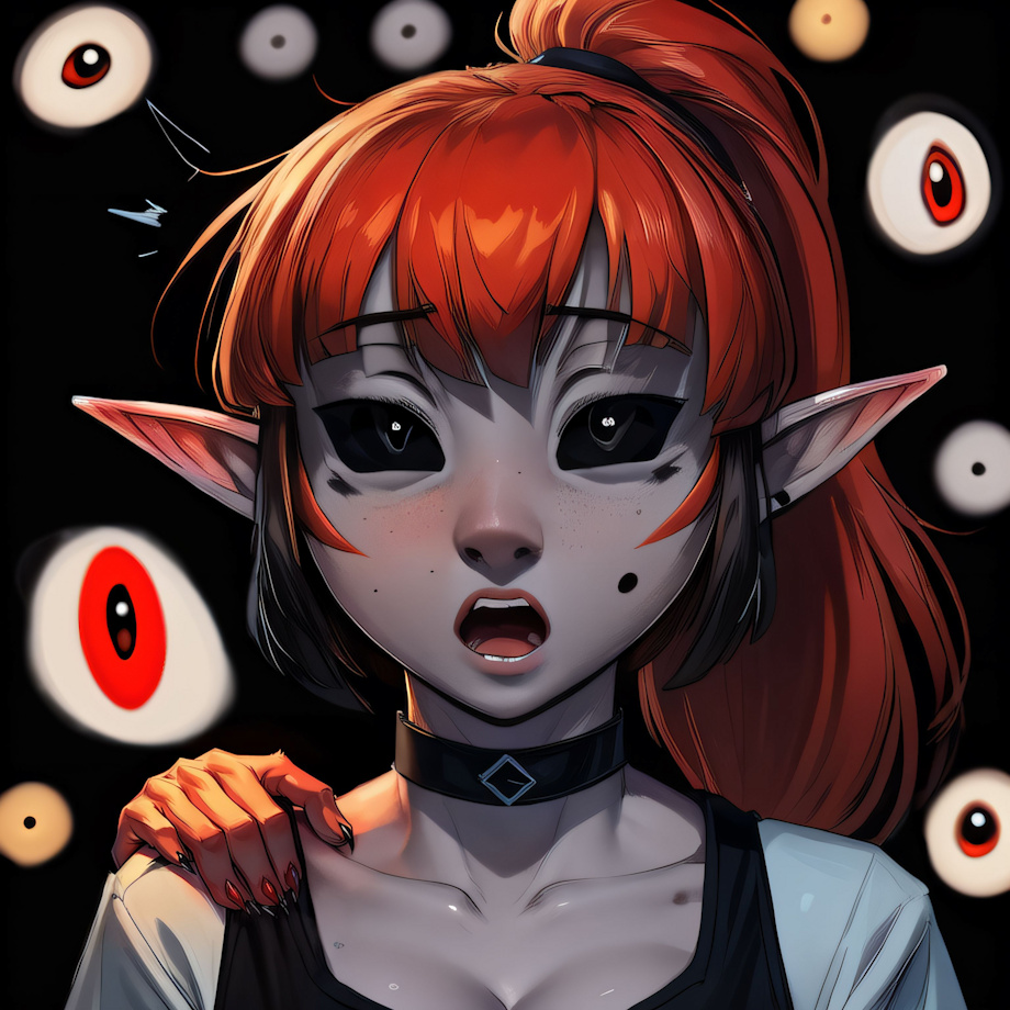 masterpiece, best quality <lora:(S) Thousand Yard Fisheye:0.9> crazy eyes, (black background with a million eyes background:1.5) (eyes wide open, eye focus, mouth open, surprised, closeup:1.4), BREAK <s4bl3> <lora:(C) Draenei:0.5> draenei, tail, horns, hooves, glowing eyes (female:1.3) (demoness:1.3) (red skin:1.8) (short hair:1.4) (green hair:1.4) (black horns:1.5) (green eyes:1.8) (pointy ears:1.4) (slit pupils:1.3) (fangs:1.3) (hairy pussy:1.4) (wrist tuft:1.4) (ankle tuft:1.4) (gold collar:1.4) (gold lip stripe:1.4) (medium breasts:1.4) (black stripes:1.4) Negative prompt: bloodshot eyes, arms behind back, hands behind back, blurry, blurry background, bad anatomy, bad hands, three hands, three legs, bad arms, missing legs, missing arms, poorly drawn face, bad face, fused face, cloned face, worst face, three crus, extra crus, fused crus, worst feet, three feet, fused feet, fused thigh, three thigh, fused thigh, extra thigh, worst thigh, missing fingers, extra fingers, ugly fingers, long fingers, horn, realistic photo, extra eyes, huge eyes, 2girl, amputation, disconnected limbs, worst quality, normal quality, low quality, low res, blurry, text, watermark, logo, banner, extra digits, cropped, jpeg artifacts, signature, username, error, sketch ,duplicate, ugly, monochrome, horror, geometry, mutation, disgusting, jpeg artifacts, bad quality, jpg artifacts,badhandv4, easynegative boring_e621_v4, (nipples, nude, nudity:2) (erect nipples:2) (topless:2) Steps: 35, Sampler: Euler a, CFG scale: 7.5, Seed: 3944800789, Size: 768x768, Model hash: 8e2f4f1346, Model: yiffymix_v44, VAE hash: 24e650297c, VAE: furception_vae_1-0.safetensors, Denoising strength: 0.42, Mask blur: 4, CFG Rescale: 0.7, Lora hashes: "(S) Thousand Yard Fisheye: 096c2fdc95ff, (C) Draenei: 669063c3b2b0", Version: v1.6.0 |