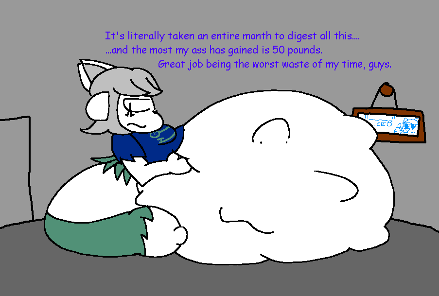 i know i should probably be using one of the few ocs i have more, but i also find it funny that she only shows up on vore day like a spirit just to get some good grub before disappearing forever going "so long suckers just do better next time"