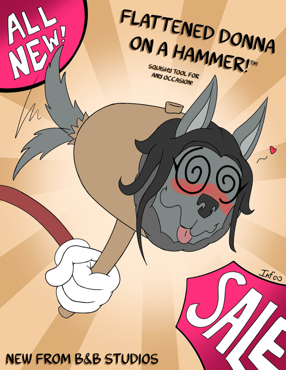 All new from B&B Studios RnD department! Flattened Donna on a Hammer! Comes will a cute flattened wolf to play and squish to your heart's content! Just stand her up, lift up the hammer, and flatten the cutie in one easy swing. Fun for you and her!