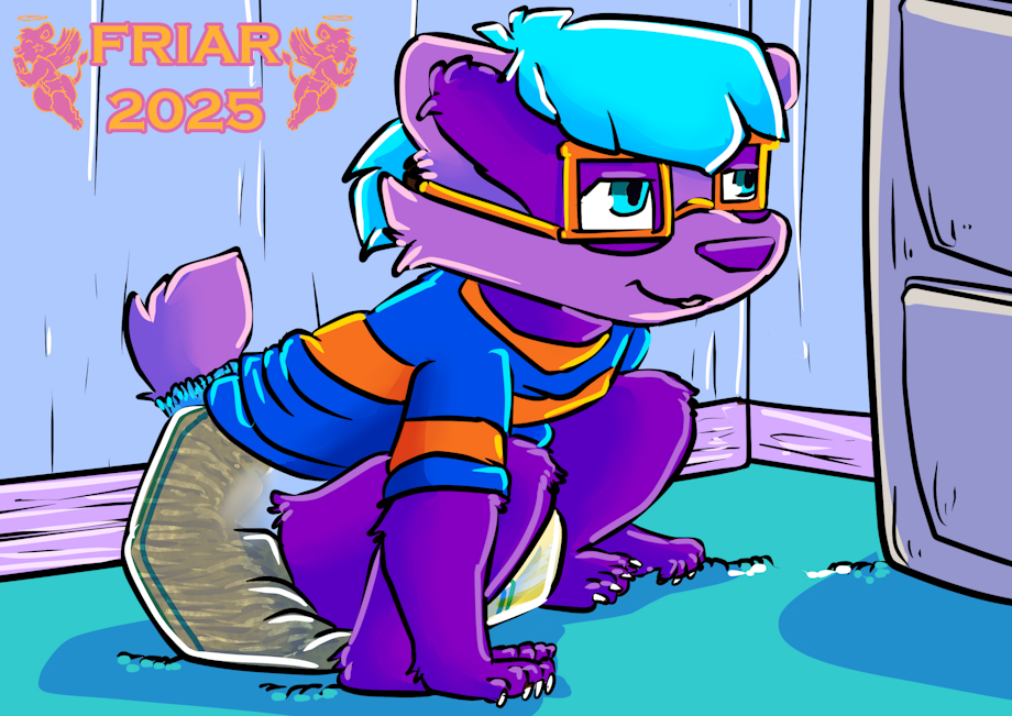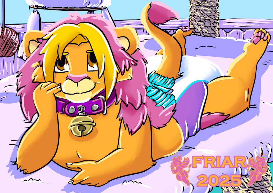 Illustration of Friar the wet and messy diapered lion wearing a bell collar and posing cutely while laying on a cat tree in the nursery. A ball of yarn is suspended next to Friar.