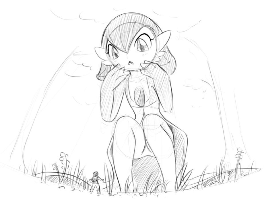 I've taken a big liking to Gardevoir being used as a giant over the years more over most other Pokemon and I've seen other artist draw very similar situations using it just like this. Gardevoir looking down in confusion on how it's trainer shrunk is cute imo.