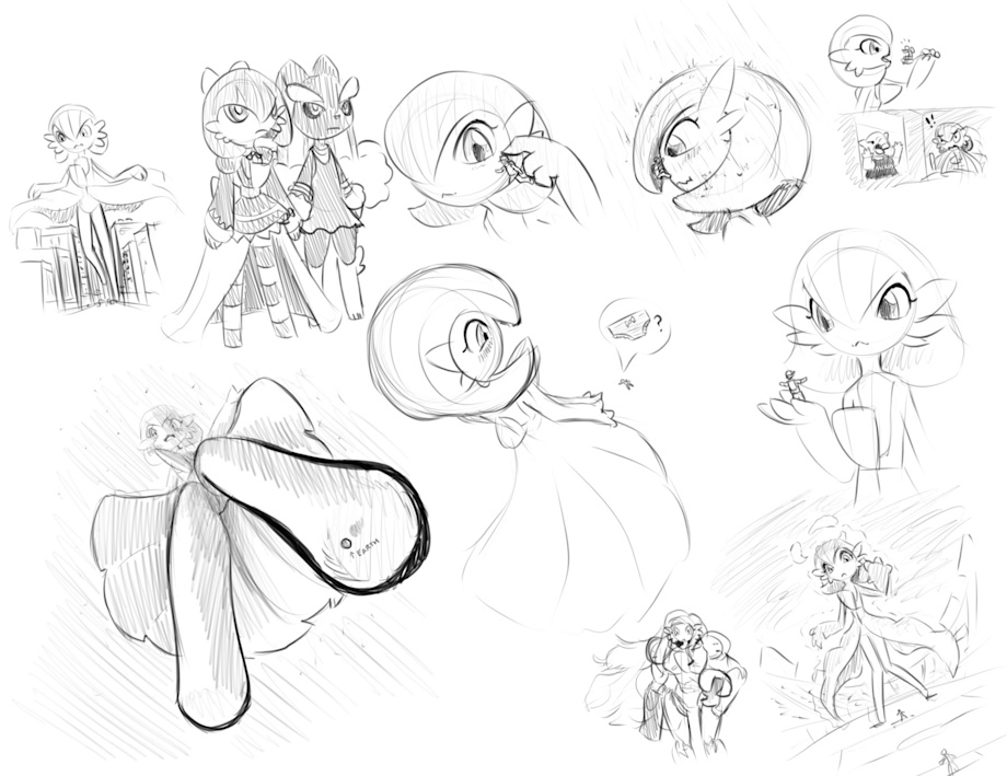 As for the big set of MORE sketches... that was an unexpected yet very welcome development! Lots and lots of Gardevoir to enjoy here, with plenty of great size ideas and doofiness to spare hahah. The protection from the rain one is particularly clever and sweet! I agree, it totally counts as pantsu POV... somehow. A much better Dynamax than the TCG provided! Her being so graceful with the skirtlift as she walks through the city, those thin legs come in handy for avoiding too tight a fit I see! The Lopanty and Stockingarde, hahahaha. The Samus helmet gag is so stupidly brilliant too... not to mention the dream eater hahahahahahah. I think the TERAstallization is my favorite, despite it being a doodle the heavy shading works well to establish the sun's harsh lighting source and the line weight makes her feel extra enormous! The return of an old friend with <-EARTH too. What a cute panicked expression!