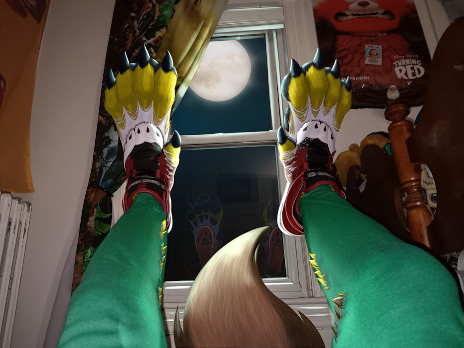 But as I lay there, rubbing my sore head, I was caught off-guard when the clouds parted, and the full moon shone itself through my bedroom window, its marvelous luminosity lighting up the paw-inspired soles of my new shoes! And before I could get up to shut the curtains, I felt tremendous pressure in my precious footwear! I moaned and groaned as two giant yellow wolf paws burst through the fronts of my new shoes! The transformation continued up my body, fur growing on my legs ripping my sweatpants, and a large tail growing out my backside! And as I bemoaned my now ruined sneakers, I swore I'd insist on getting a warranty on any future footwear purchase! These were gonna be expensive to replace!