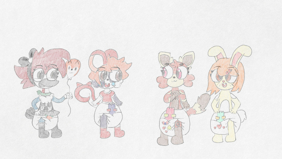 Coloured version of a friendship anniversary gift for Wolfdemon21/WolfPuppy21 since I met him back in April 2023, sorry for the delays since I have issues with my Wii U gamepad xwx So here are Marshy, Fade, Milly and our special guess Trixie/Tina Timber (from TurboToothPick) hanging out while having fun together ^^