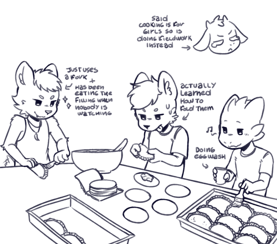 so like, im feeling like trash for some reason, last night i wanted to draw something to make me feel better- so, bbk kids (minus Racky) making empanadas.