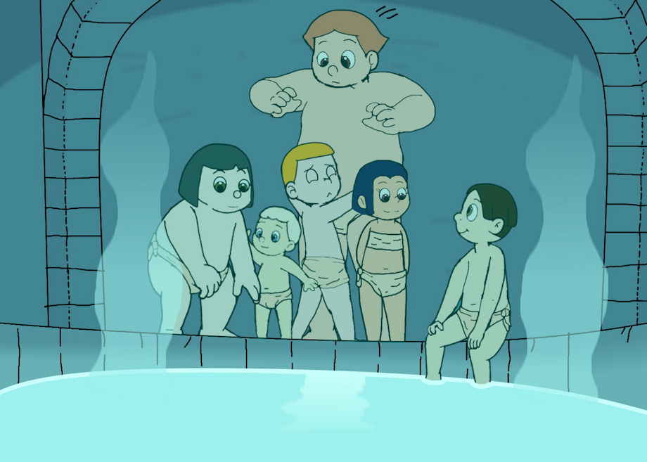 Реми позвал купаться в забавный бассейн. Рендал, Сиза, Бончи, Тимо и Кинтаро пошли. Придя в глубь каменной пещеры, заброшенной, обнаружили, что вода теплая. Это был горячий источник. Рендал засунул ноги, и сказал, что вода приятная. Можно заходить. Однако Тимо против, опасаясь свариться, и приобнял Бончи, озадачив, в чем дело.