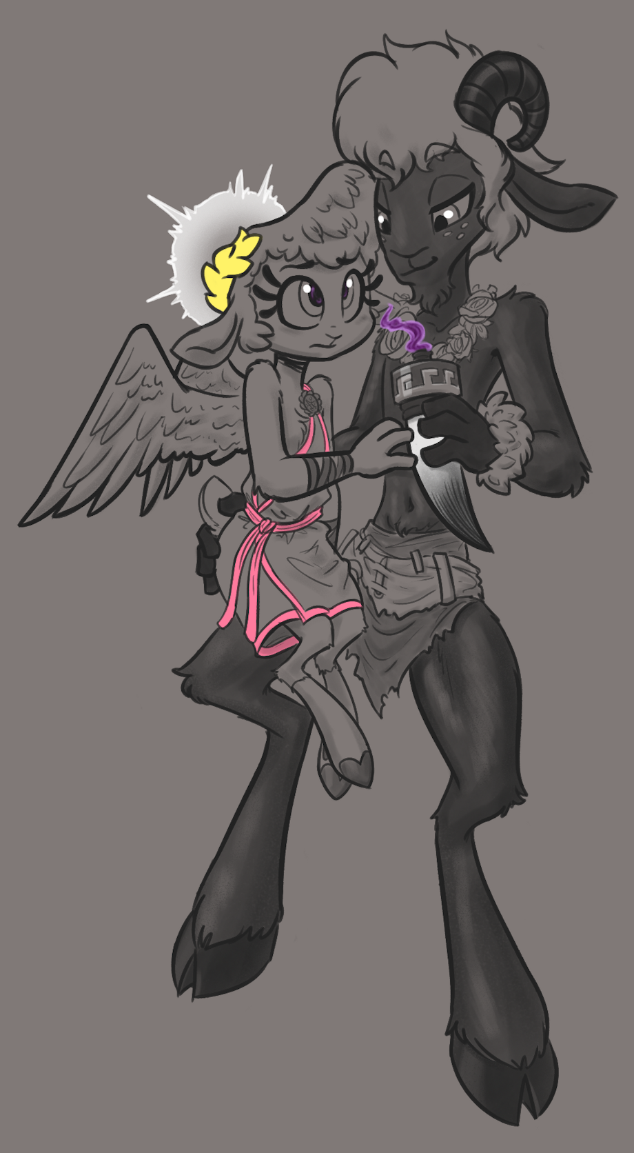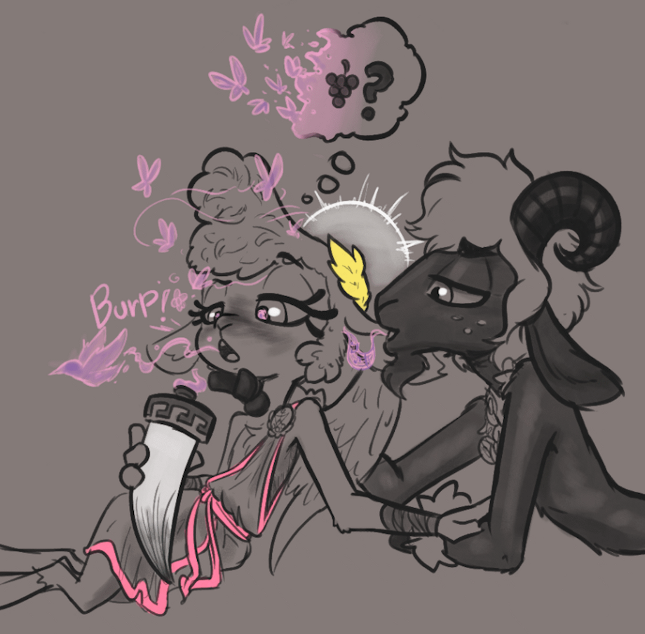 The Horn that she drinks from is a Satyr speciality. Carved from the tusk of a mystical boar that lives deep in the Fey realms and enchanted with powerful magics, it allows the Satyr to simply crush a handful of any berries into it to create something to drink. The flavour and effects of the drink depend on what the Satyr desires, and what sorts of berries fill the majority of the container. More importantly is that the Horn can hold an entire lake worth of alcohol at any given time.