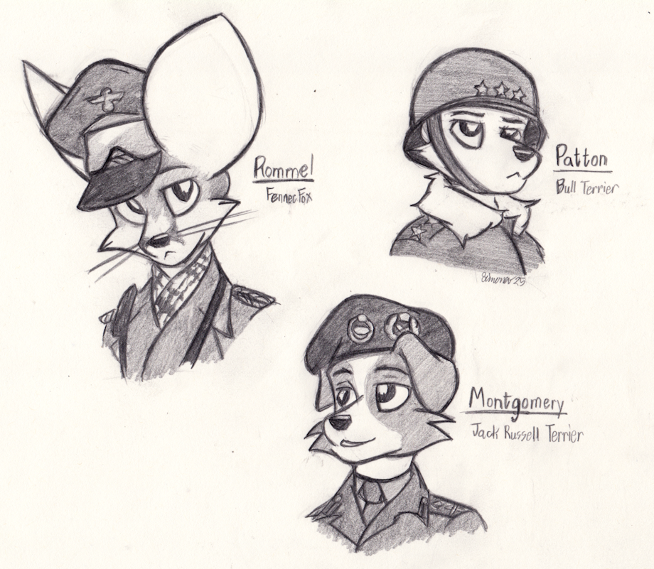 I don't know much about Montgomery but I believe you got Patton and Rommel down pat. With Rommel's nickname of "The Desert Fox", a fennec fox is perfect to represent him. Patton was known for being aggressive so a bull terrier (one of the more aggressive dog breeds, from what I've been told) is also perfect.