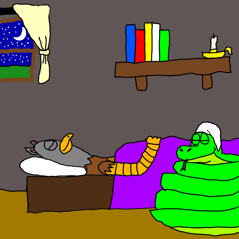 It was nighttime in the village. Feathers and Slither Scale had been working on renovating the bedroom. Slither had installed curtains for the window, and the shelf where he had placed his candleholder, and where Feathers had stacked his books. They were sleeping together as they always do, mostly because of Slither determined to keep his beloved gryphon safe from harm. Feathers sleeps in his bed, and Slither coils himself up like most snakes, with a nightcap on his head, sleeping peacefully with his tongue slithering.