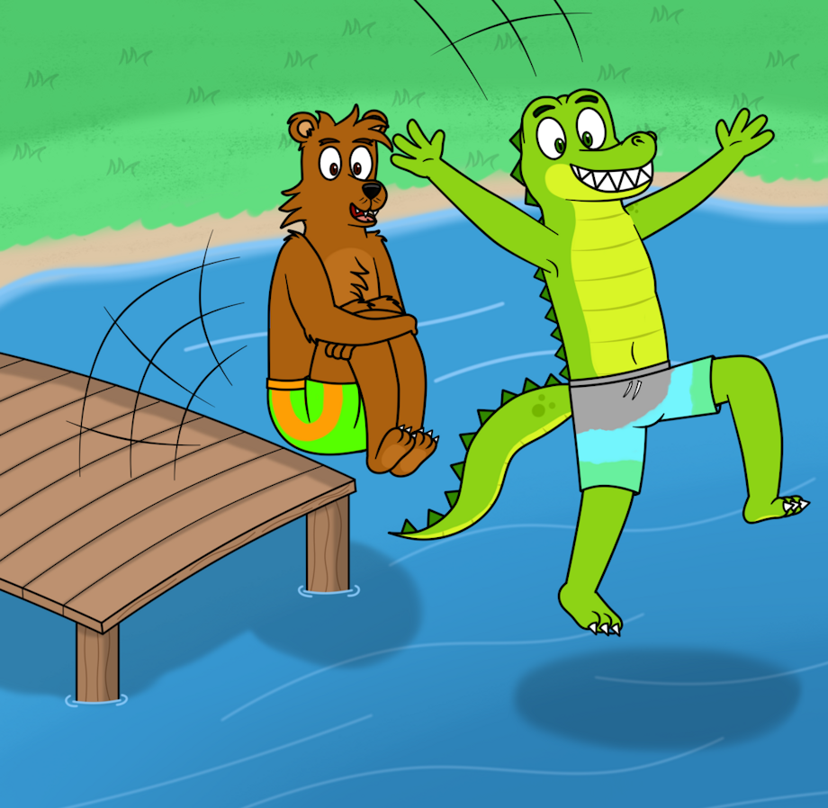 Croc and Bert have gone to the lake to hang out, so they both put on their swimsuits and run to go swimming in the lake.