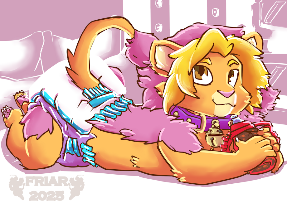 Illustration of Berry the wet and messy diapered fox posing in front of his bed with his sippie cup, his pinkie held out, his other paw patting his bottom.