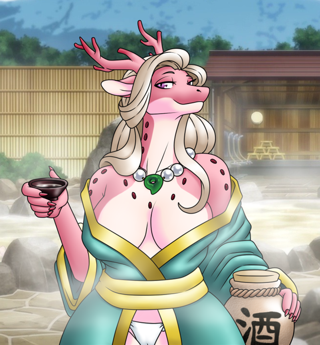Mistress Yukiko came to this land to open a onsen, her body emits huge amounts of hot steam. The more exited she geets, the higher the amount. COmbined with herbs sh consumes, they steam can even take on some medicinal properties. She tends to drink tomuch sake to relax... which makes the steam also potent to get people drunk... she is a huge lady and often times intimidates guests... usually consisting of the temple maidens... and she does have a sweet spot for Koharu... who avoids her... doesn't stop the dragoness to tease the young fox from time to time~