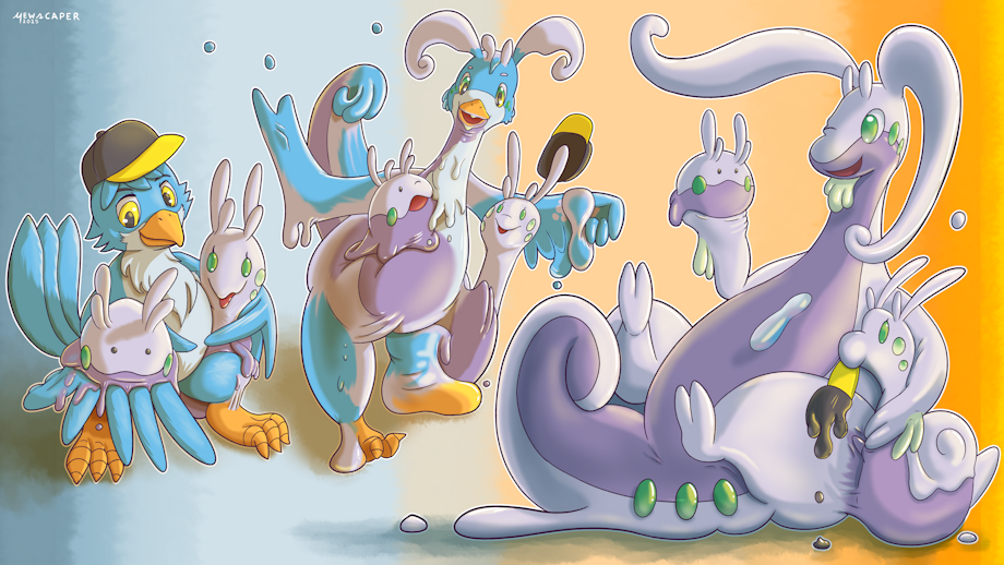 ALT Description Text (Re-posted): A three-part comic sequence of a cartoonish blue songbird wearing a black-and-yellow ball cap (named Goldeneye) transforming into the large goopy drake-like pear-shaped Pokémon, named Goodra. Goldeneye is happily being transformed with the help of pre-evolved Goomy and Sliggoo, gooping and melting his feathers and features into the Goodra. By the third part, Goo'ldeneye is fully transformed, and his hat is melting away.