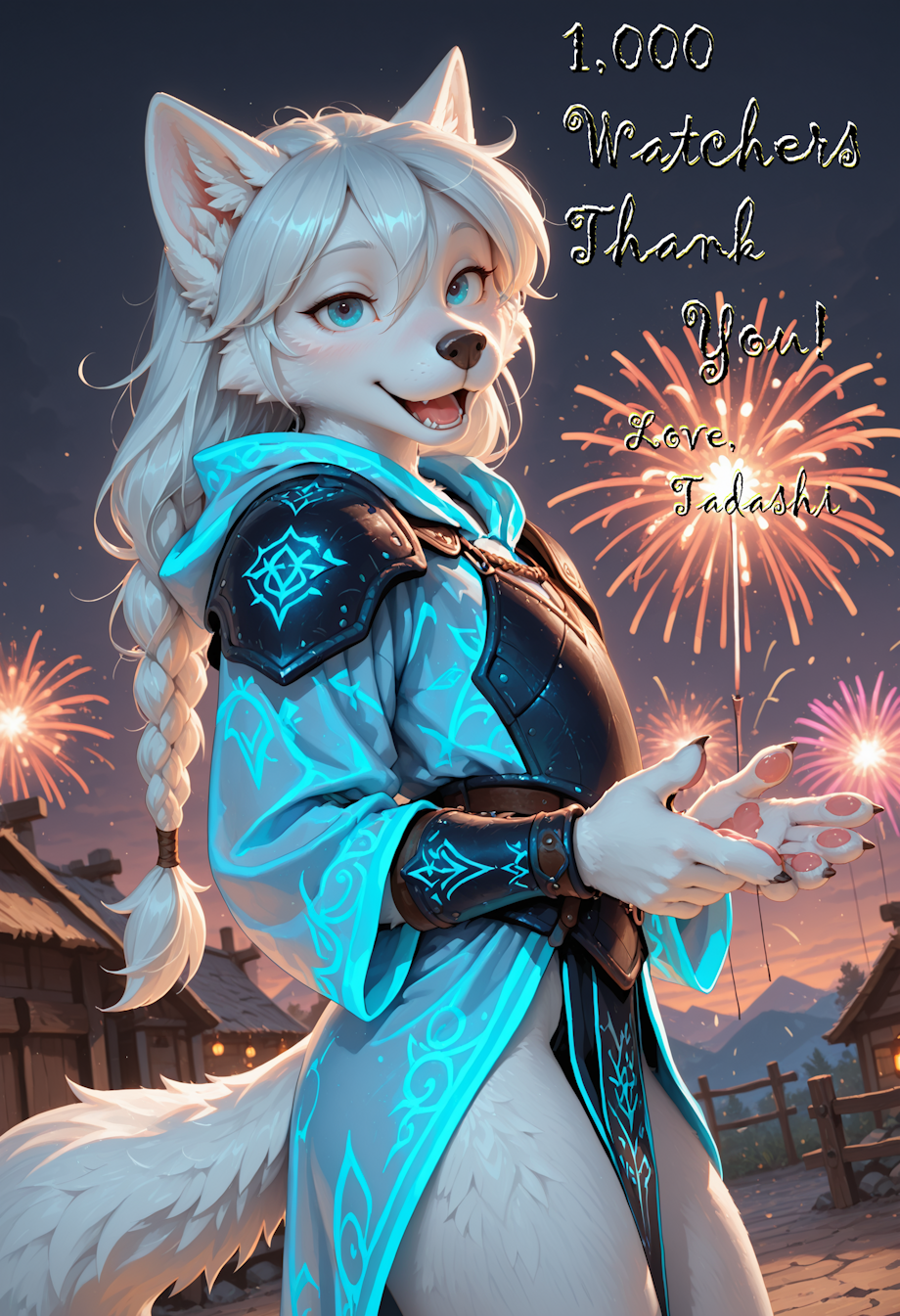 anthro, (young:1.3), cub, underage, (Arctic fox:1.3), white fur, white body, white ears, white arms, white legs, long hair, white hair, straight hair, (hair between the eyes:1), (tribal braids), blue eyes, skyrim setting, (outside:1), (Village festival background:1.2), (Streamers), (performers in background), (Partying), medival, light blue Wizard robes, (casting a spell:1.5), (summoning fireworks:1.5), male, looking at viewer, pinks pawpads, DnD, Dungeoans and dragons, clothed, <lora:leatherarmor:0.6> leather armor, leather shoulder pads, leather bracers, leather shin guards, open mouth, Charming smile, looking at viewer, Seductive, bedroom eyes, <lora:RedPantherArt_Style:1>, Dynamic pose, <lora:StS-Illustrious-Detail-Slider-v1.0:1>, <lora:[Malebolgia] Custom Goober 38 (femboy) Style Illustrious:1> customgoober38il